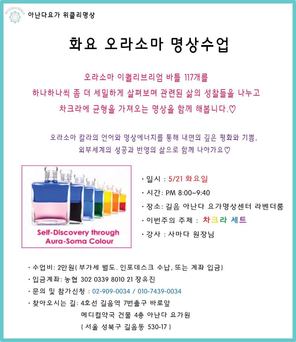 오라소마 화요명상 수업이 있어요. 이번주 주제는 '차크라 세트'입니다^^