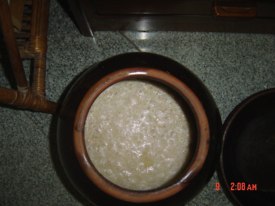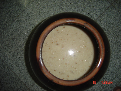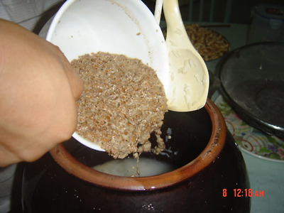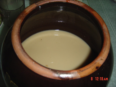5. 항아리에 소량의 물에 녹인 효모와 누룩 230그램(맥주잔으로 2컵)과 물 8ℓ를 넣고 잘 저어서 누룩과 효모가 골고루 용해되게 한다.
