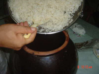 6. 고두밥을 풀어 해쳐 온도를 체온보다 조금 낮은 정도의 낮추어 항아리에 넣고 잘저어 준다.