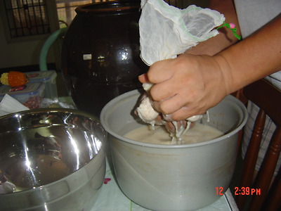 술이 다 되면 용수를 박아서 술을 떠 내거나 광목천 자루로