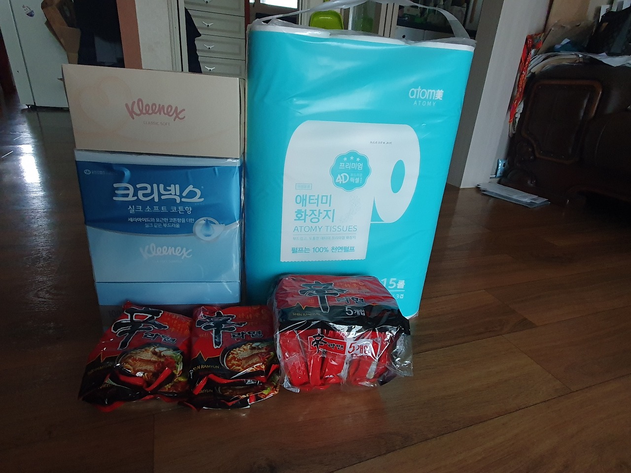 휴지와 크리넥스, 라면 등 선물을 한보따리 받아서 왔다.
