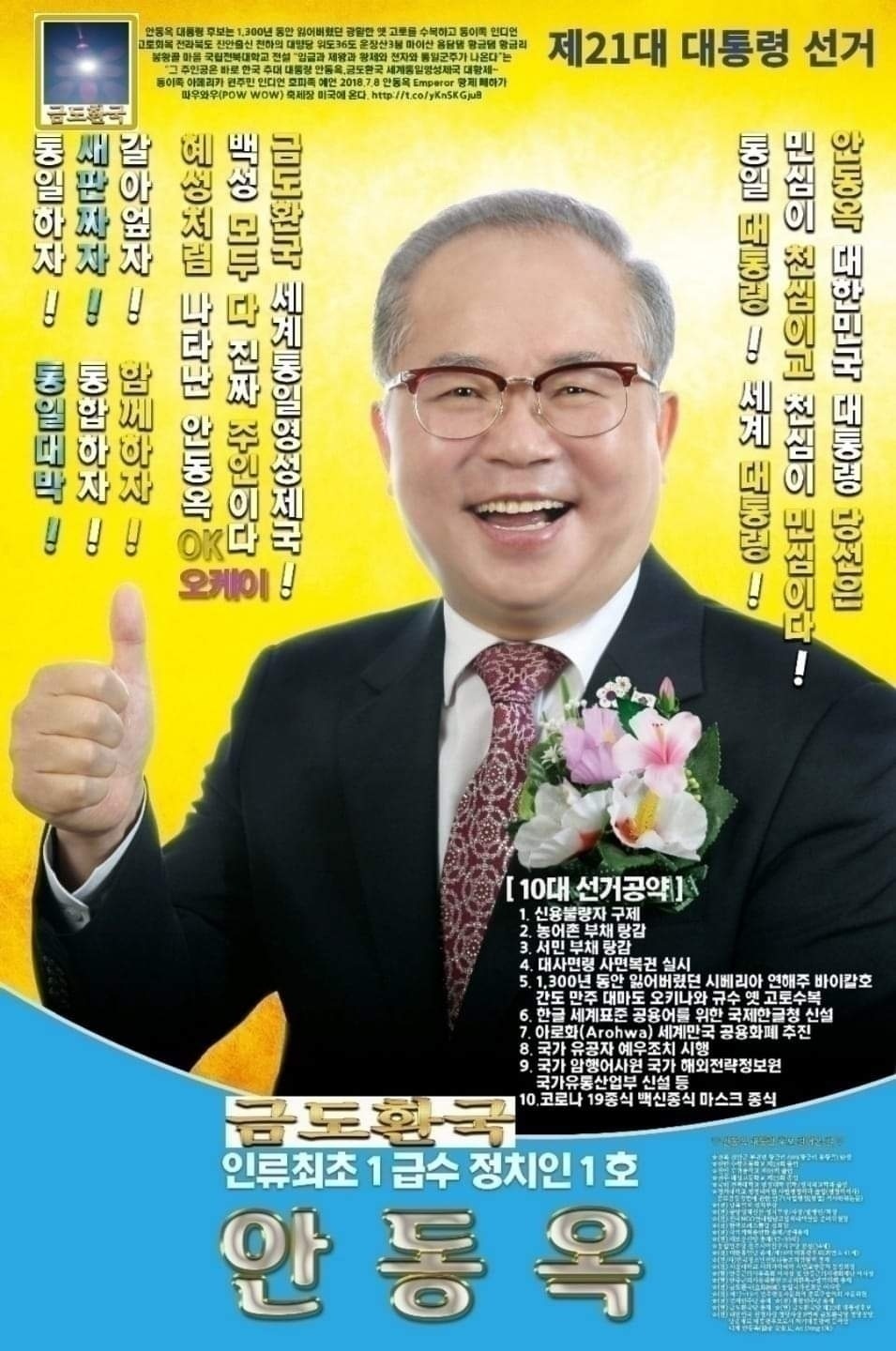 안동옥 대한민국 차기대통령으로 당선되어, 청와대 대통령궁으로 무혈입성하는 그 날까지 최선을 다하고, 1,300년 동안 잃어버렸던 광활한 옛 선조들의 고토를 수복하여, 931회 외침을 받고도 면면이 이어 온, 환민족의 위상과 기상을 강화하여, 5대양8대주 지구촌의 세계와 우주삼라만상에서, 원시반본 원시복본되는 통일된 나라인 통일환국인 지상천국의 금도환국을 이뤄, 황제폐하로 천자성하로 통일군주로 자리매김 함으로써, 한글세계화추진원에서 한글의 세계화를 이뤄 세계만국공용어로 자리매김 할 것이며, 아로화(Arohwa)가 세계기축통화로 자리매길될 것입니다.
