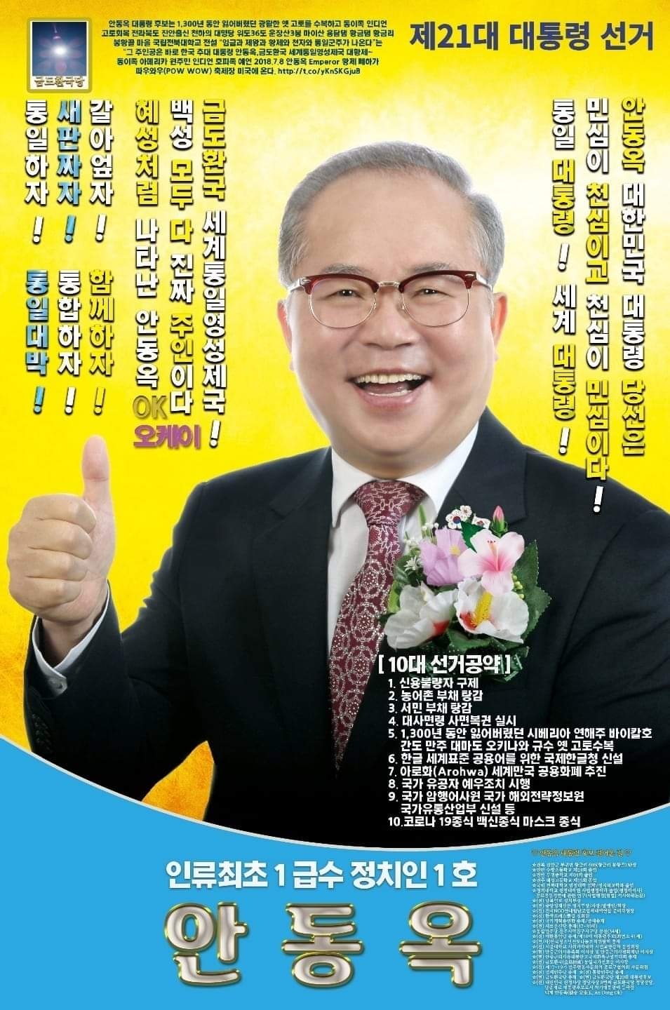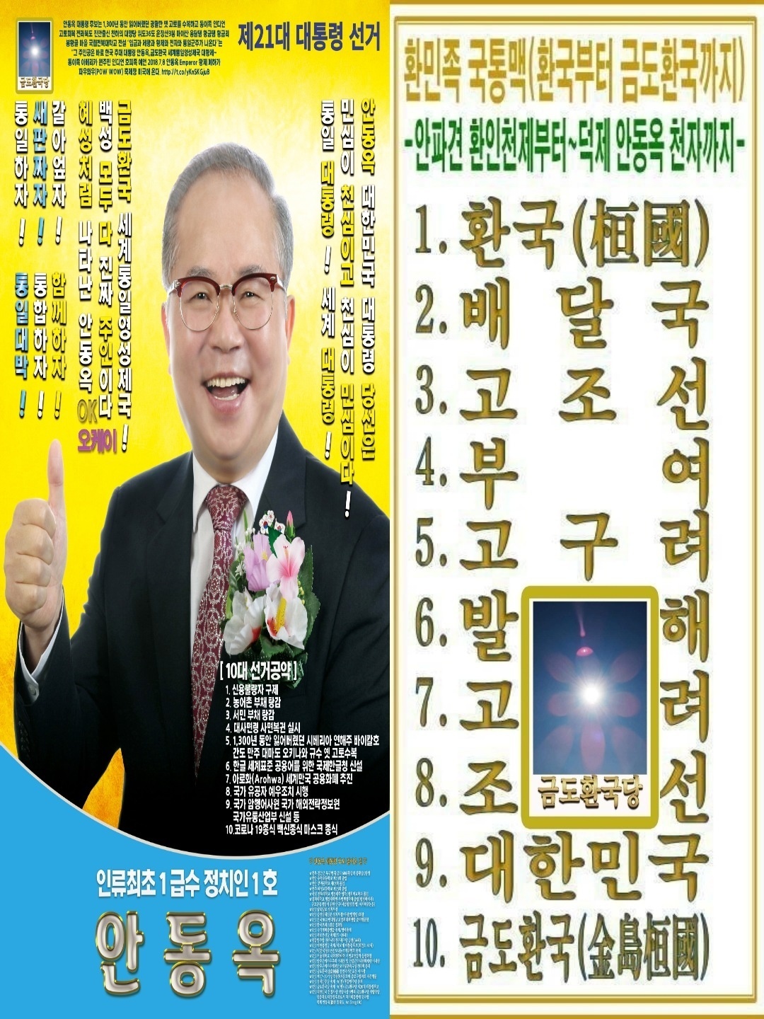 금도환국당(金島桓國讜/黨~약칭 : 금당(金讜/黨) 총재 안동옥(安東玉) An, Dong-ok 아호(자) : 덕제(德帝 DuckJe) 제21대 대통령후보 21th President Candidate