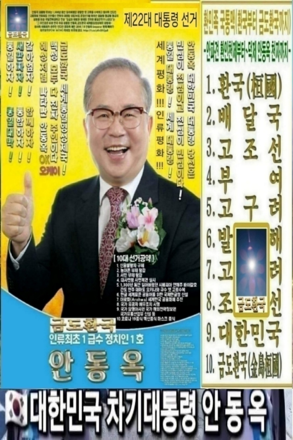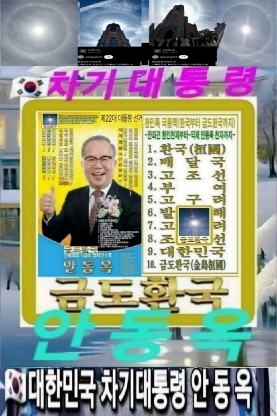 작성자안동옥 금도환국金島桓國 통일군주작성시간23.05.11조회수1,488 목록 댓글 0한국차기대통령 당선될, 금도환국당 창준위 총재 안동옥 안중근의사유족회 이사장 안동옥 안동옥 한국 차기대통령 천심이 민심이고 민심이 천심