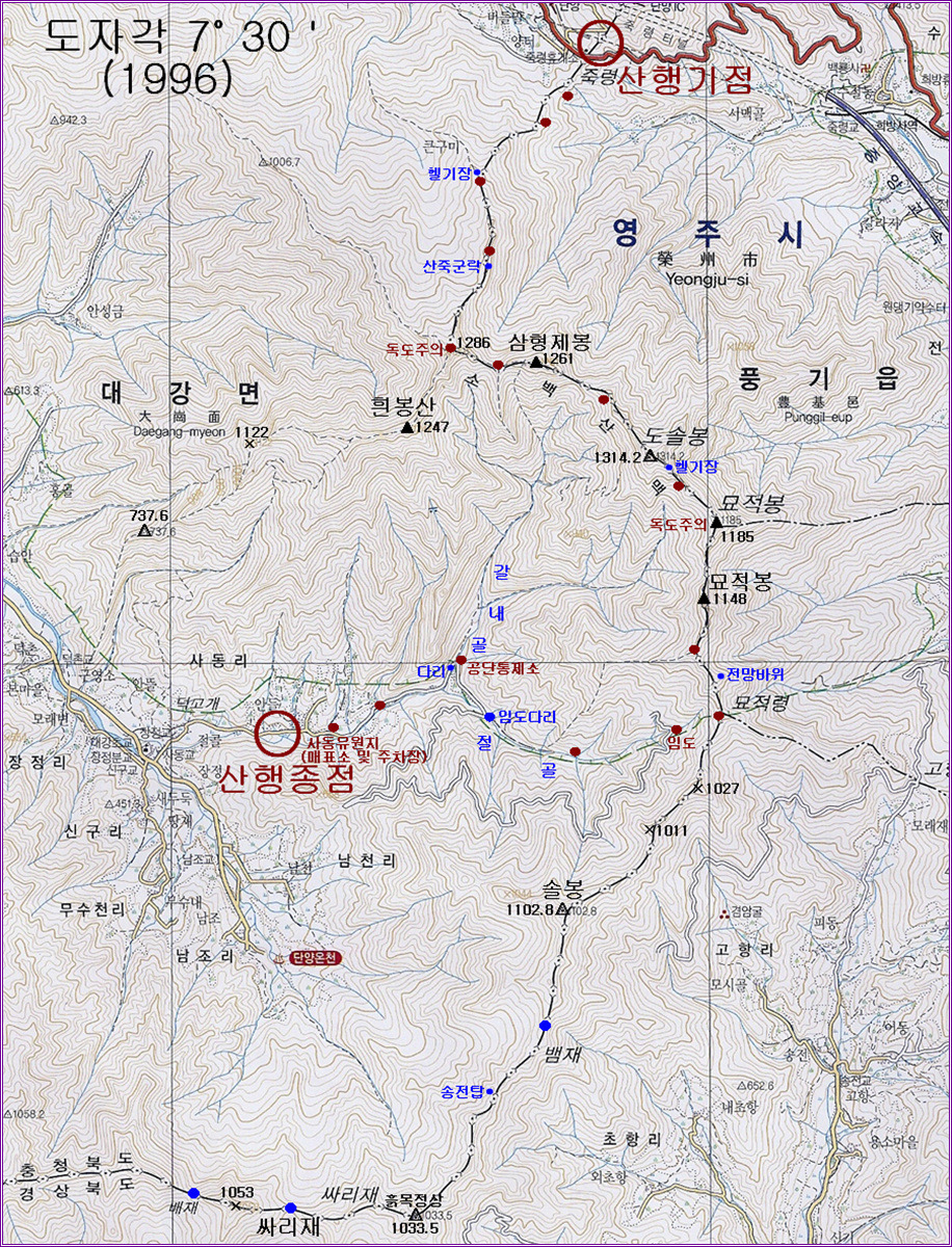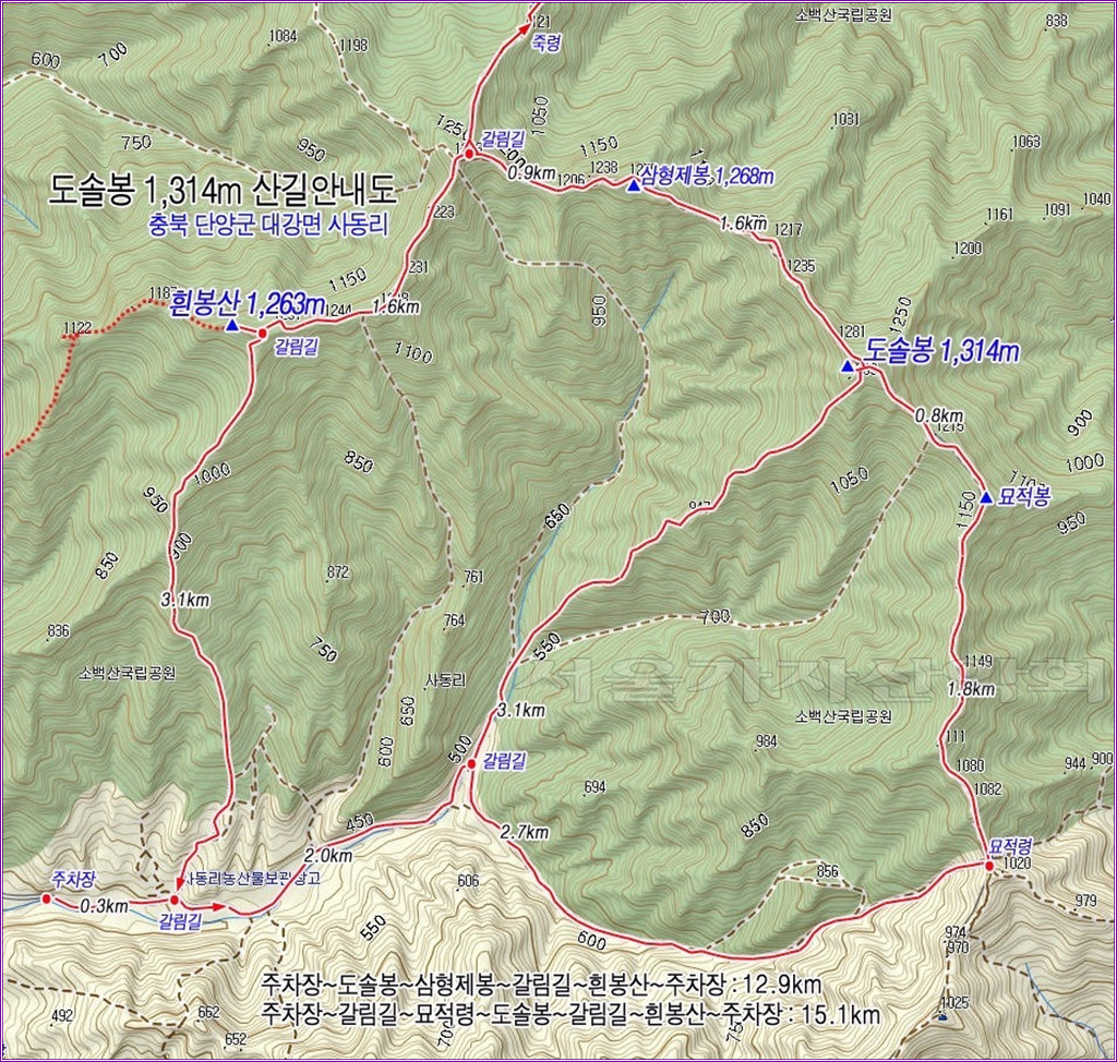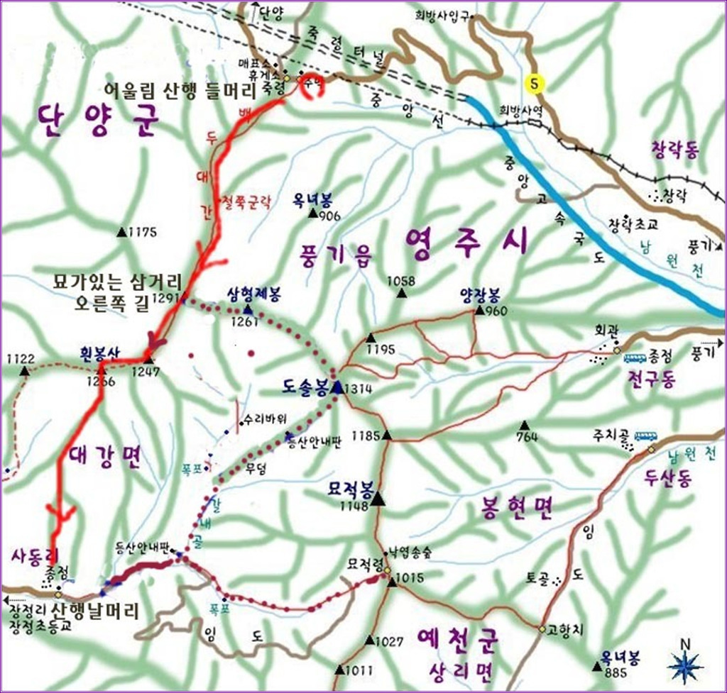 A코스:죽령~샘터~흰봉산갈림길~삼형제봉~도솔봉~묘적봉~묘적령~사동리