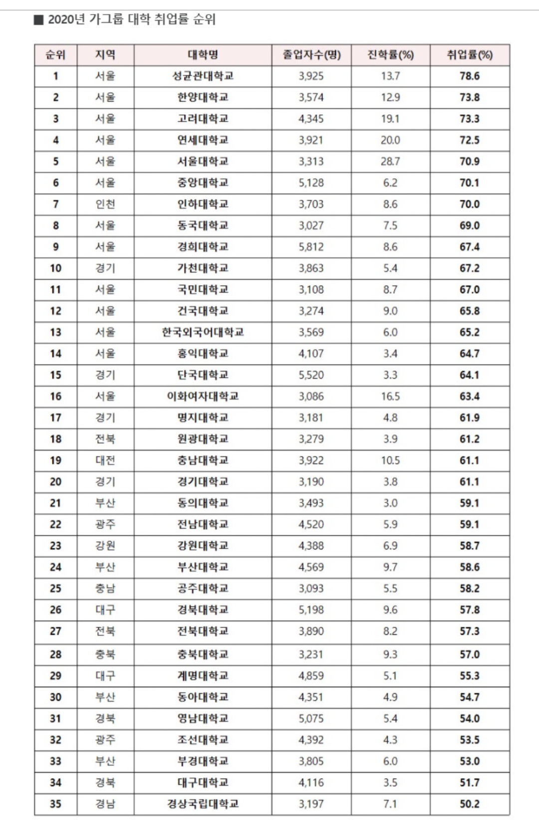 2020 한국대학 취업률 순위(4년제) 작성자하늘바라기|작성시간22.03.03|조회수806 목록 댓글 0 글자크기 작게가 글자크기 크게가 에듀진 제공 다음검색 현재 게시글 추가 기능 열기 북마크 공유하기 신고 센터로 신고 댓글 댓글 0 댓글쓰기 답글쓰기 댓글 리스트