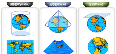 투영좌표계란 3차원의 지구 타원체를 2차원인 평면 상에 투영한 좌표계입니다.