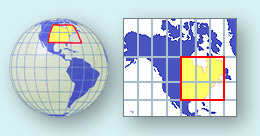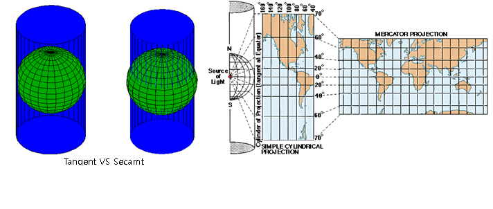 왼쪽과 같은 구면을 원통에 넣고 투영하면 오른쪽 그림과 같이 평면에 지도가 그려지는데,