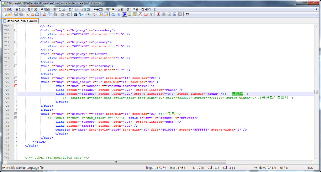 이렇게 보일겁니다. 여기서 등산로 선의 색상과 두께는 딱 두줄만 고치면 됩니다.