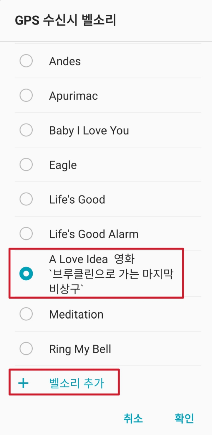 gps수신시 벨소리는 기본 목록에서 선택하거나 자신의 폰에 mp3 음악이 저장되어 있으면 mp3 음악으로 지정하는것입니다. -