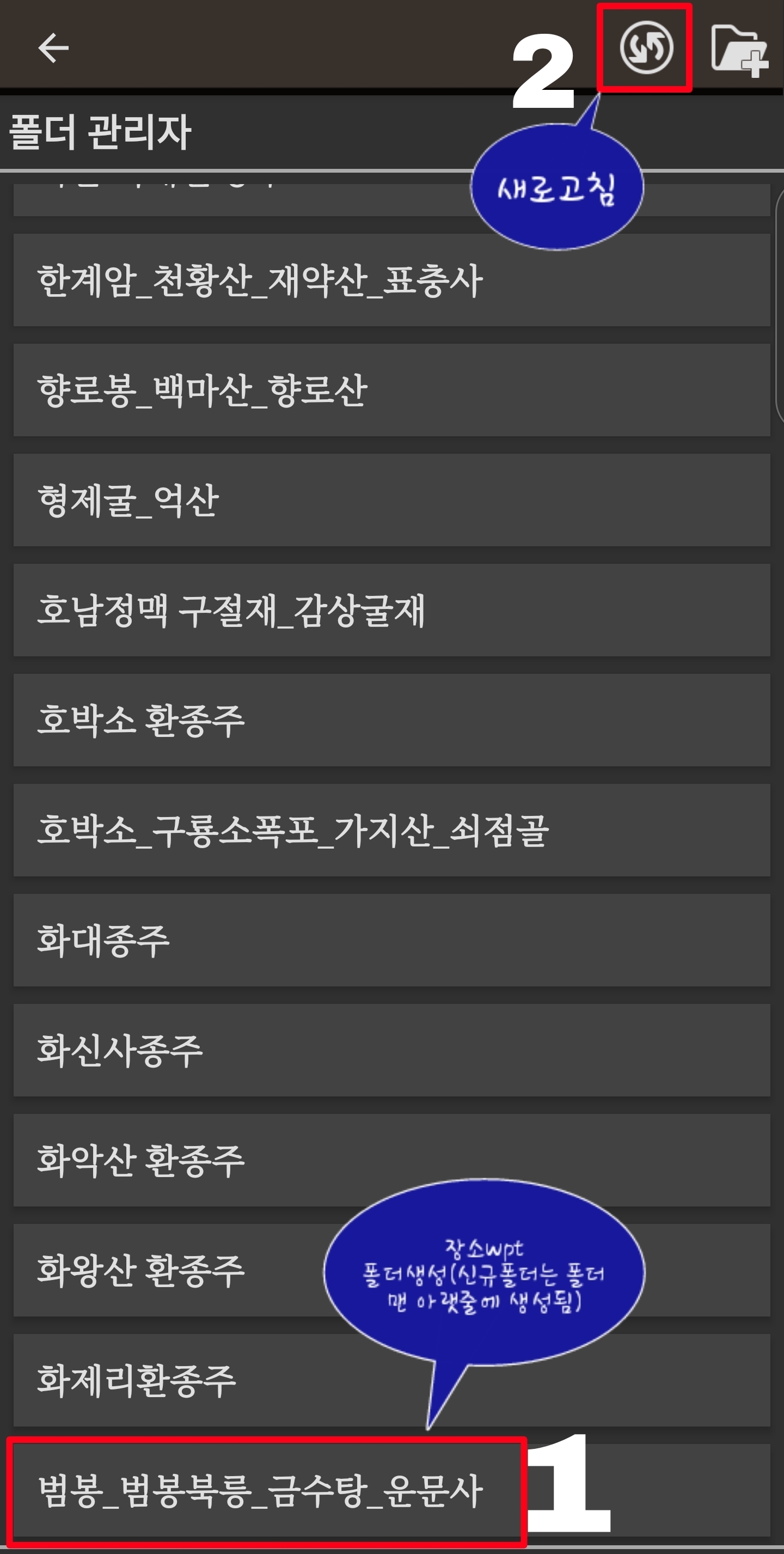 ▼ 폴더 맨아래에 트랙/wpt 이름(폴더명)이 생성된것을 확인후 상단의 새로고침 아이콘을 누른다