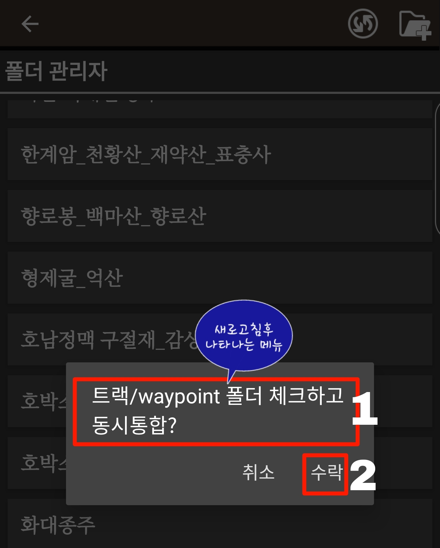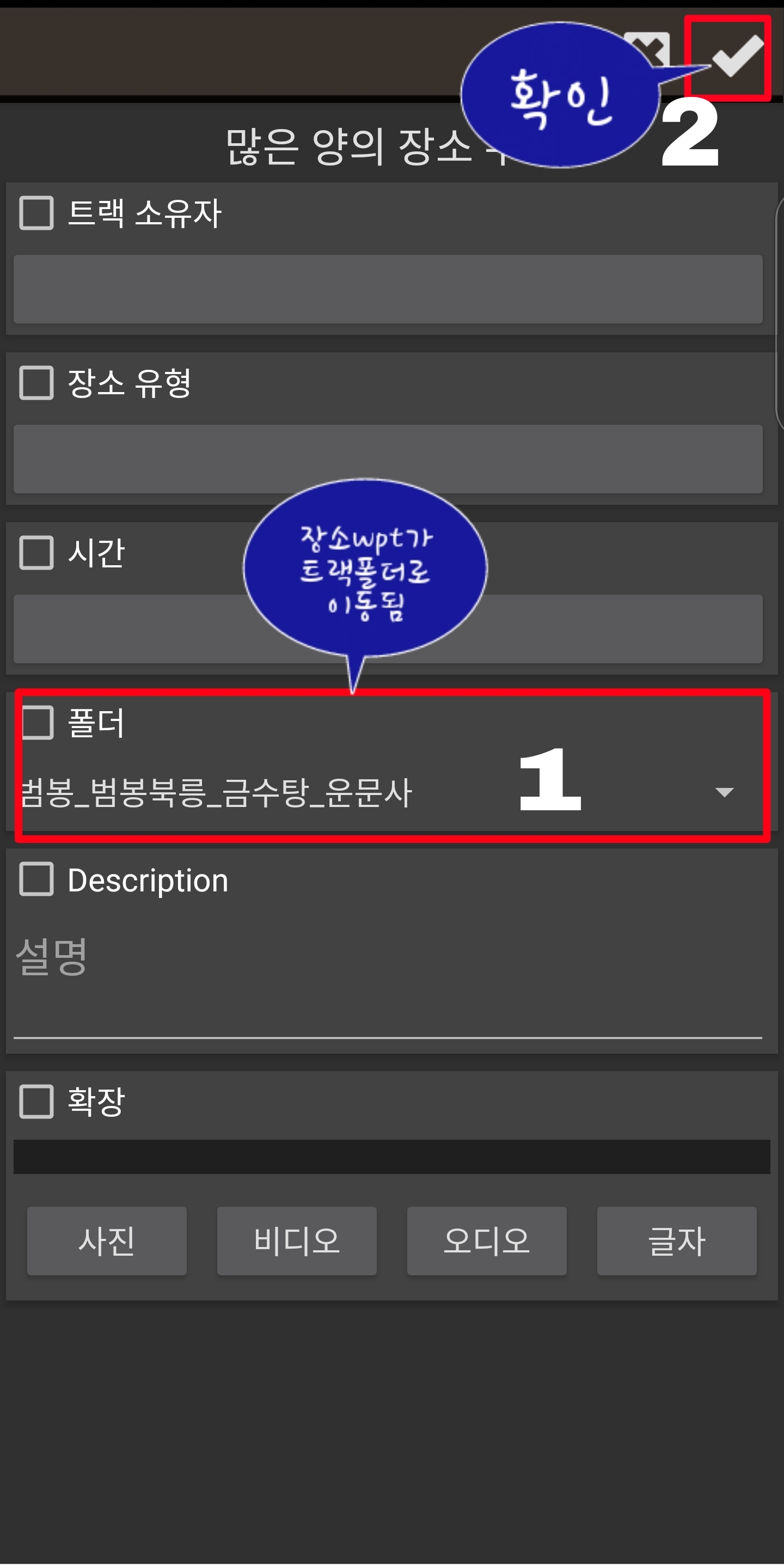 ▼ 트랙관리에서 장소wpt를 정리할 최근 트랙을 선택후① ,