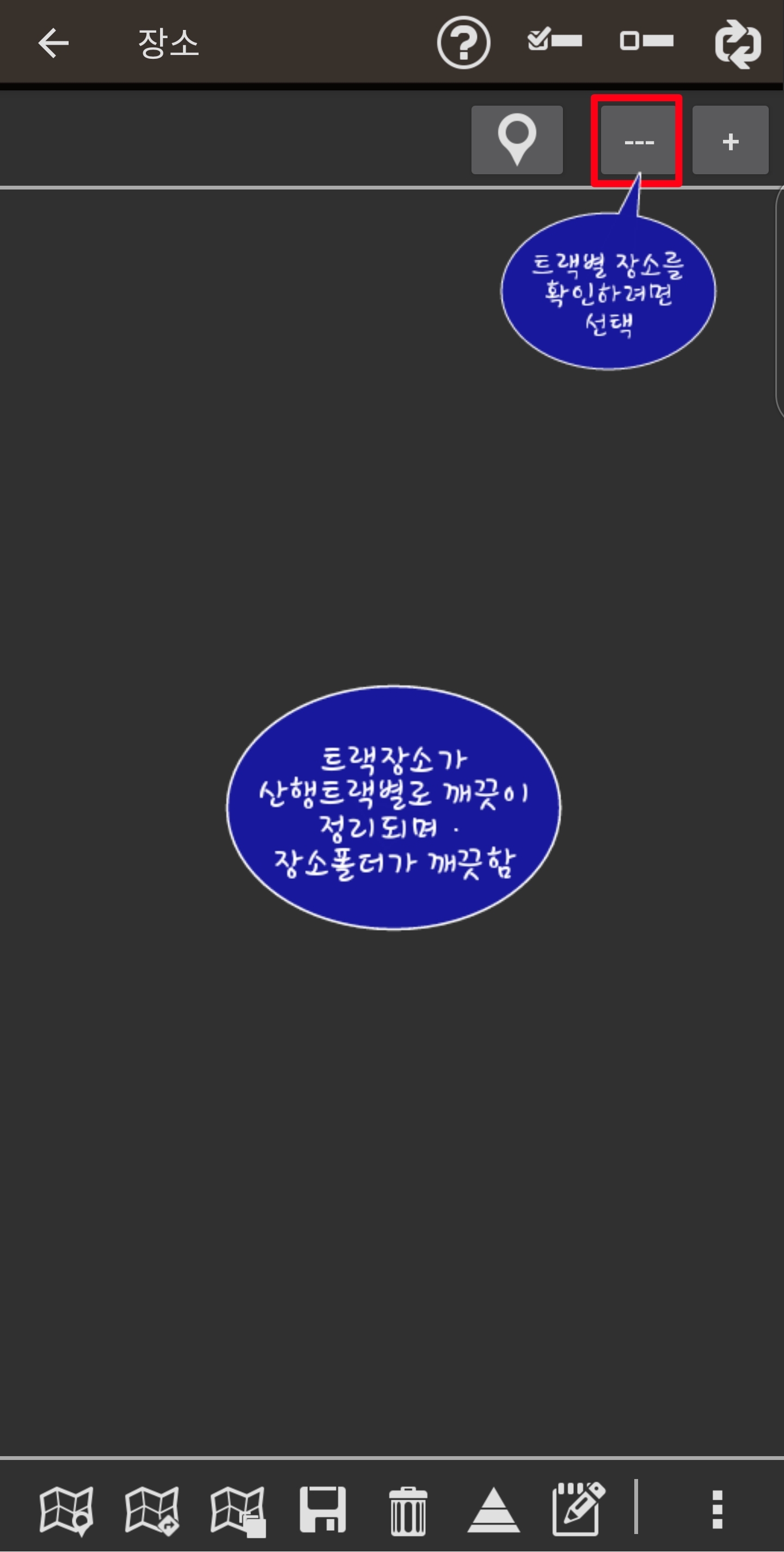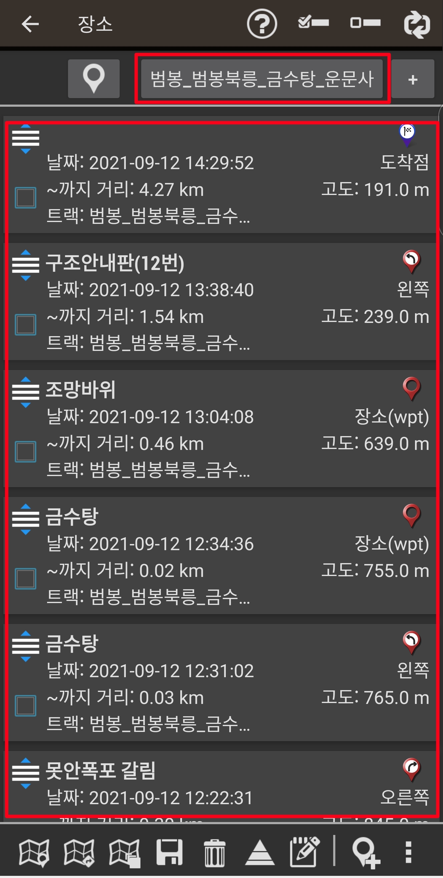 트랙별 장소wpt를 확인및 찾기위해서 상단 아이콘을 선택하면