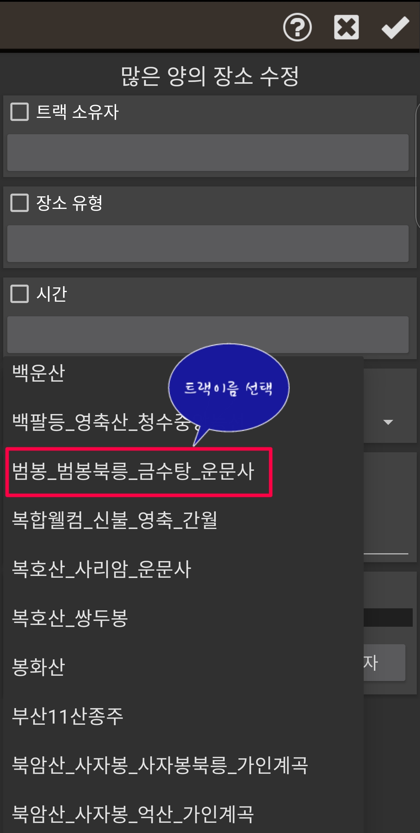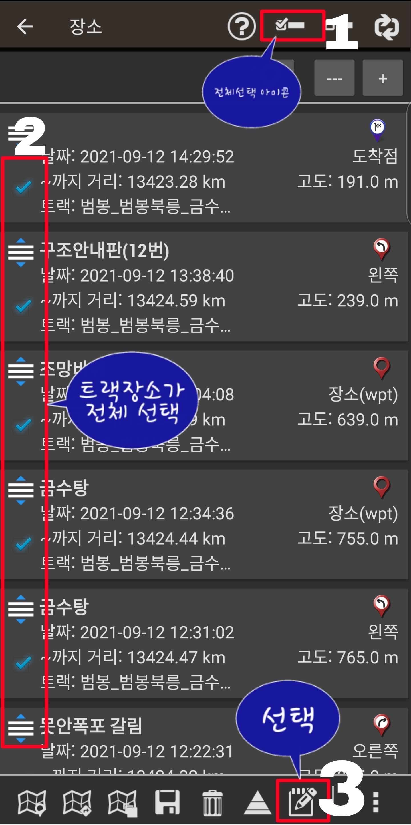 ▼ 산행 트랙에 첨부된 장소를 전체선택① 하고
