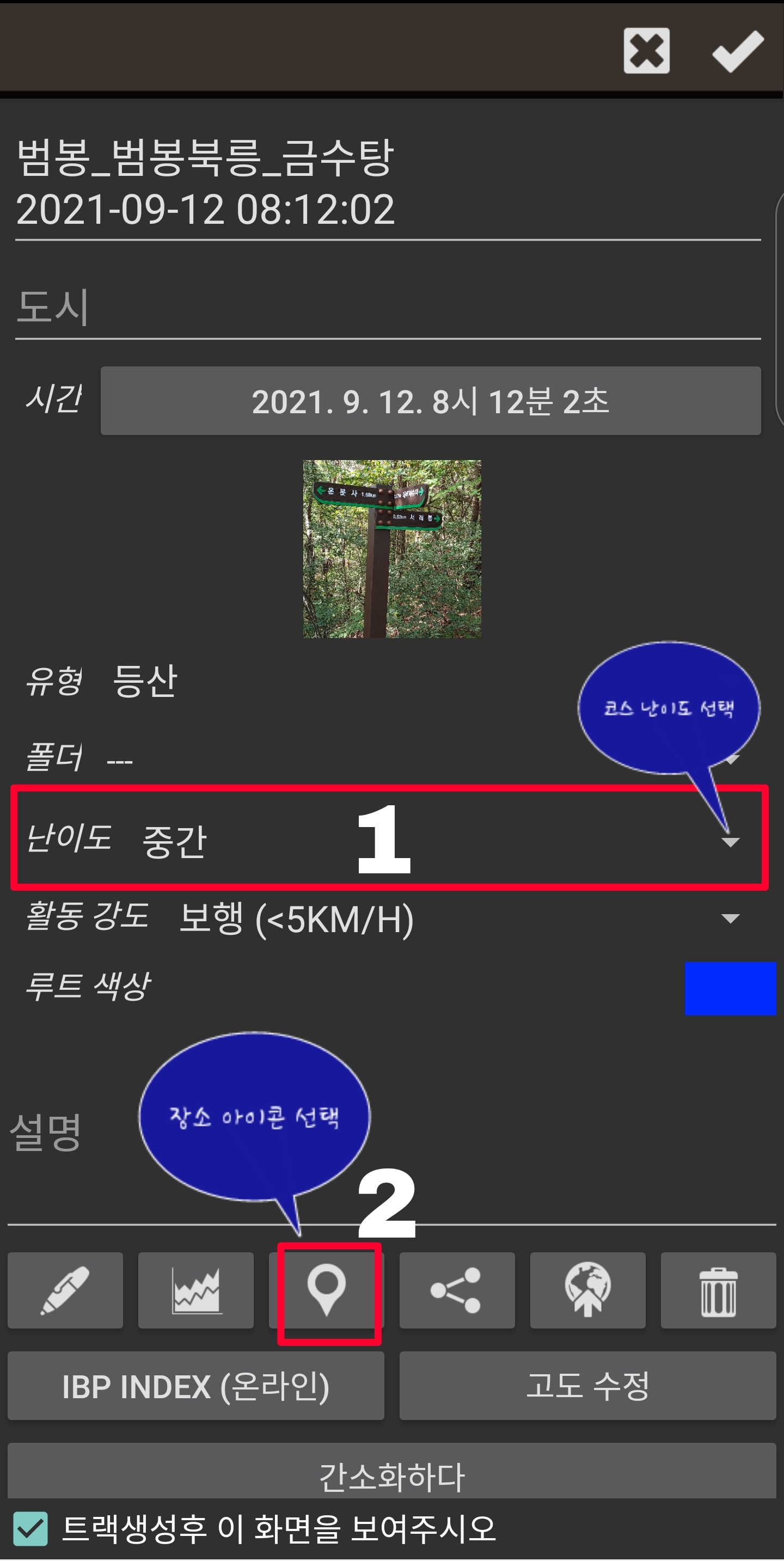 ▼ 트랙정보가 나타나면 생성된 트랙의 산행난이도① 를 입력하고,