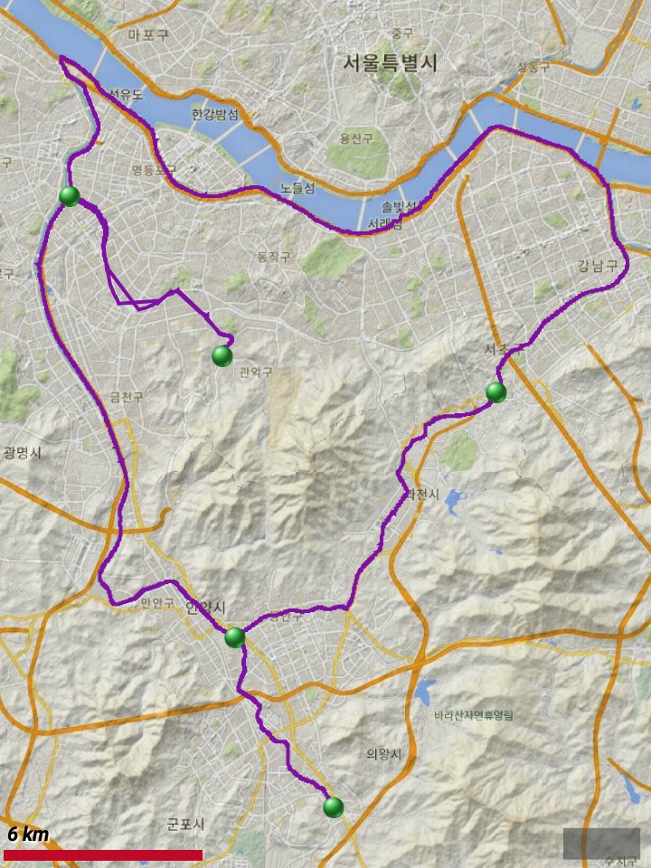 3. 여행코스 : 양재천-과천-안양천(시점 왕복)-도림천(왕복)-한강-탄천-양재천