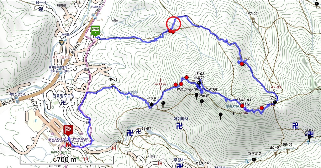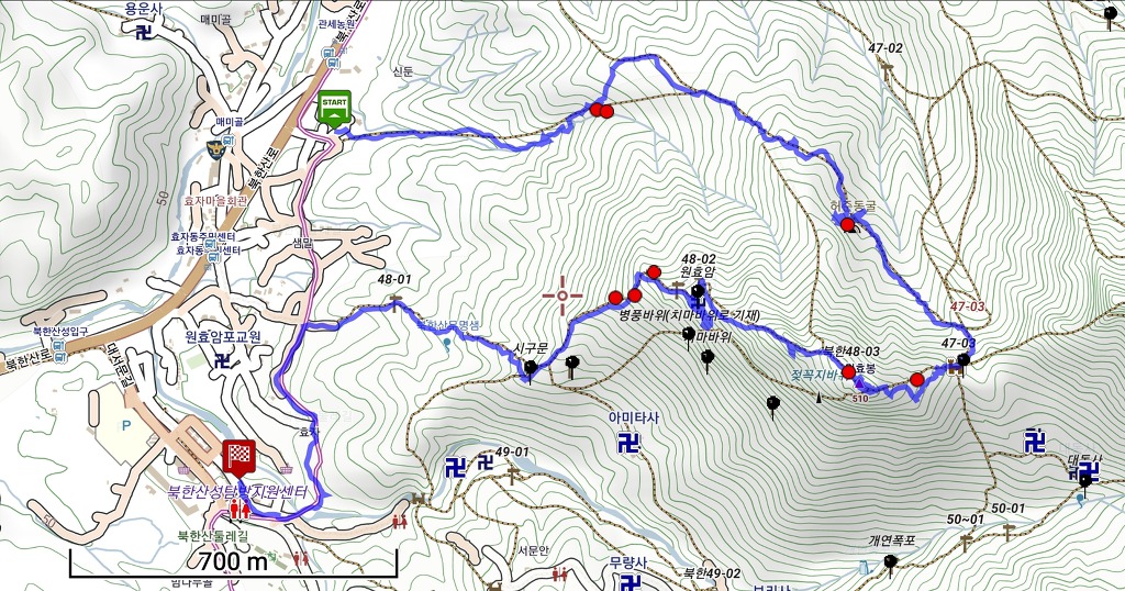 3. 산행코스 : 관세농원-신둔계곡-신둔슬랩길-허준동굴-북문-원효봉-원효암-효자동-북한산성입구