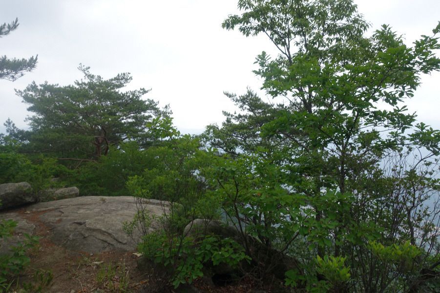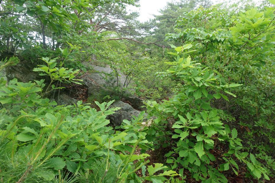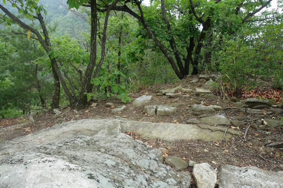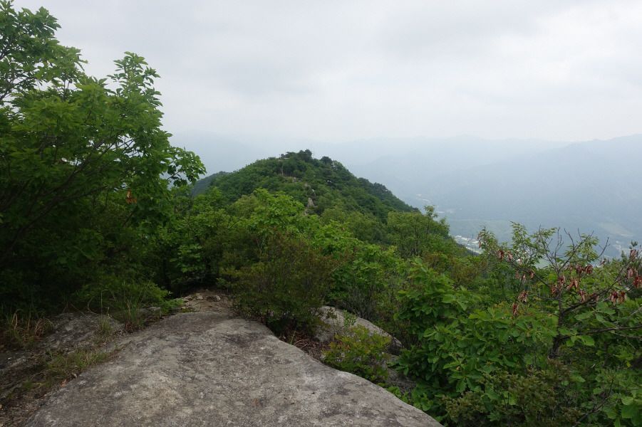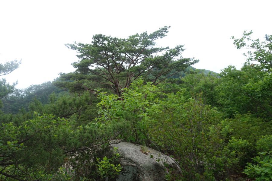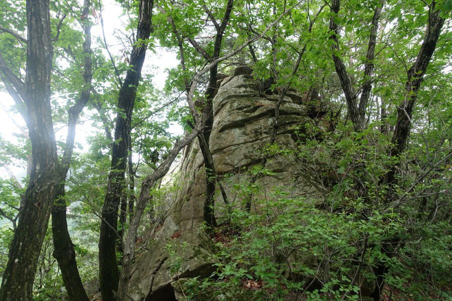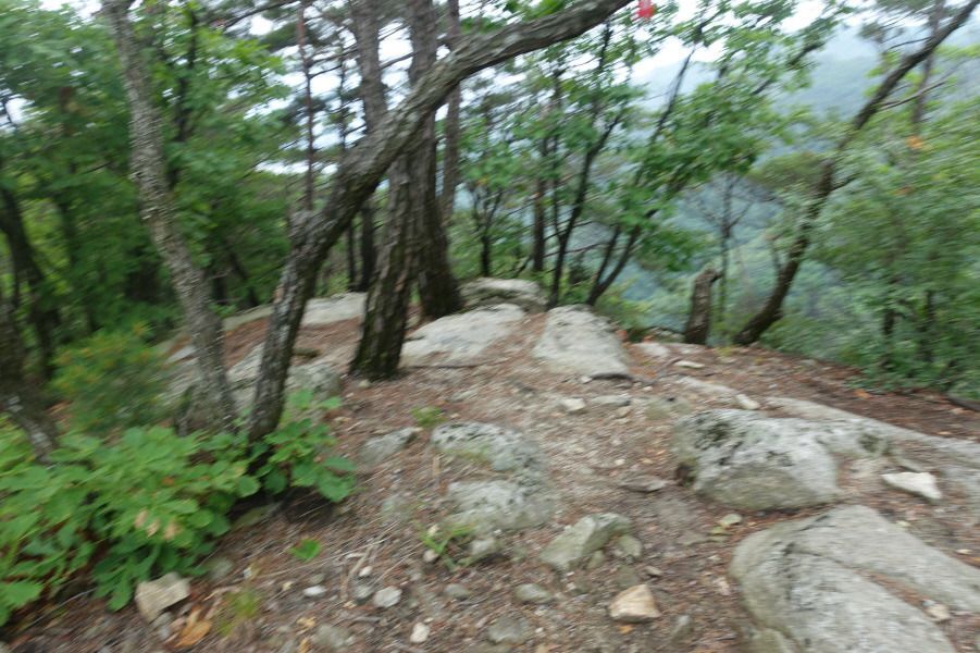 588봉을 넘고 완만해진 산길 따라 여우고개로 이어지는 명성지맥 주능선 3거리로 올라 바람없는 무더운 날씨 속에 아기자기하게 펼쳐지는 암릉지대를 따라간다. 명성지맥상의 주능선(690봉)이