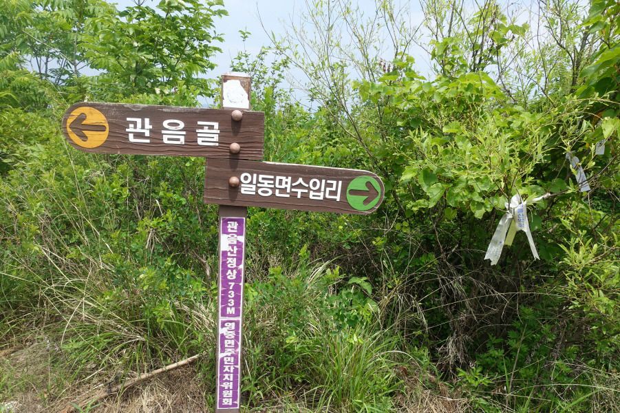정상석있고 이정표(일동면수입리/관음골) 서있다. 조망은 양호하다. 선두대장 표지기와 깔지가 파주골 방향으로 붙어 있어 날머리가 바뀐 것인지 싶어 전화통화 하고 이정표(일동면 수임리) 방향으로 완만한 하산길을 잡는다. 하산 능선길은 양옆이 천길 낭떨어지다. 급경사길 조심스럽게 내려 선다. 건너편 지나온 사향산이 보이고 (13;58)하산길 중간 유일한 이정표(수임리/정상)을 만난다.