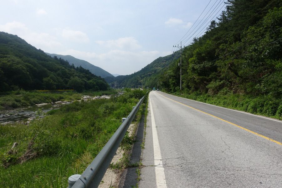 장암2교를 건넌다. (09;01)교량을 건너 좌측으로 도로를 약10m 이동하여 우측 임도를 따른다. 옛날 지도상 등산로는 동화사나 백련사쪽으로 되어 있는데 이를 따를 경우 고속도로처럼 확장한 직선의 47번 국도가 지나가고있어 (무단횡단 또는 굴다리)통과 하기가 어렵다.