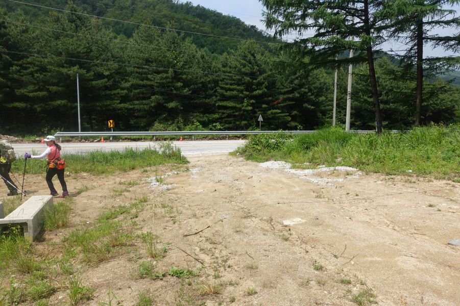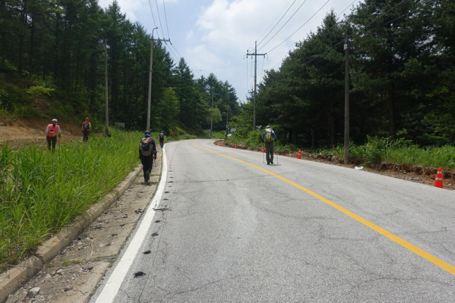 날머리로 정한 38휴게소 쉼터에는 산악회 버스를 이리저리 찾아보아도 없습니다. 이명남대장은 전화가 불통이고 전창완 총무님께 연락하니 약500m 정도 파주골 방향으로 이동한 곳에 있다 합니다. 지친 몸을 이끌고 차량이 씽씽달리는 더운 아스팔트길을 약13분/약1km를 걸어서 (13;53) 버스가 정차해 해있는 공터로 이동합니다. 산악회 허용시간 (14;00) 7분 전에 도착한 것이 그나마 다행입니다.