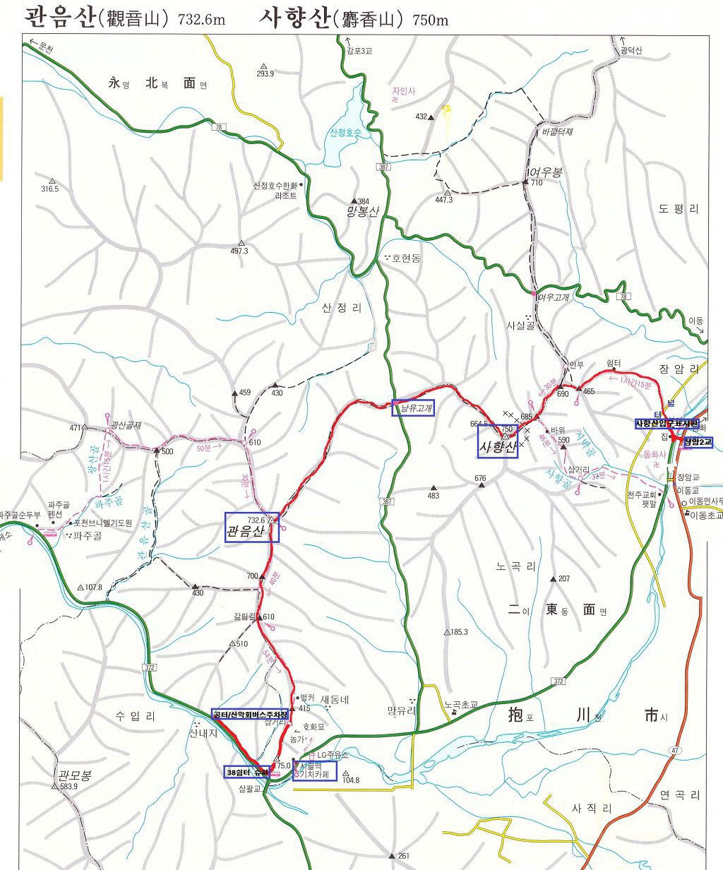 3. 산행코스 : 장암2교-587.6봉-688.6봉-사향산(737.4m)-675.9봉-남유고개-570.5봉-관음산(732m)-410.2봉-삼팔쉼터