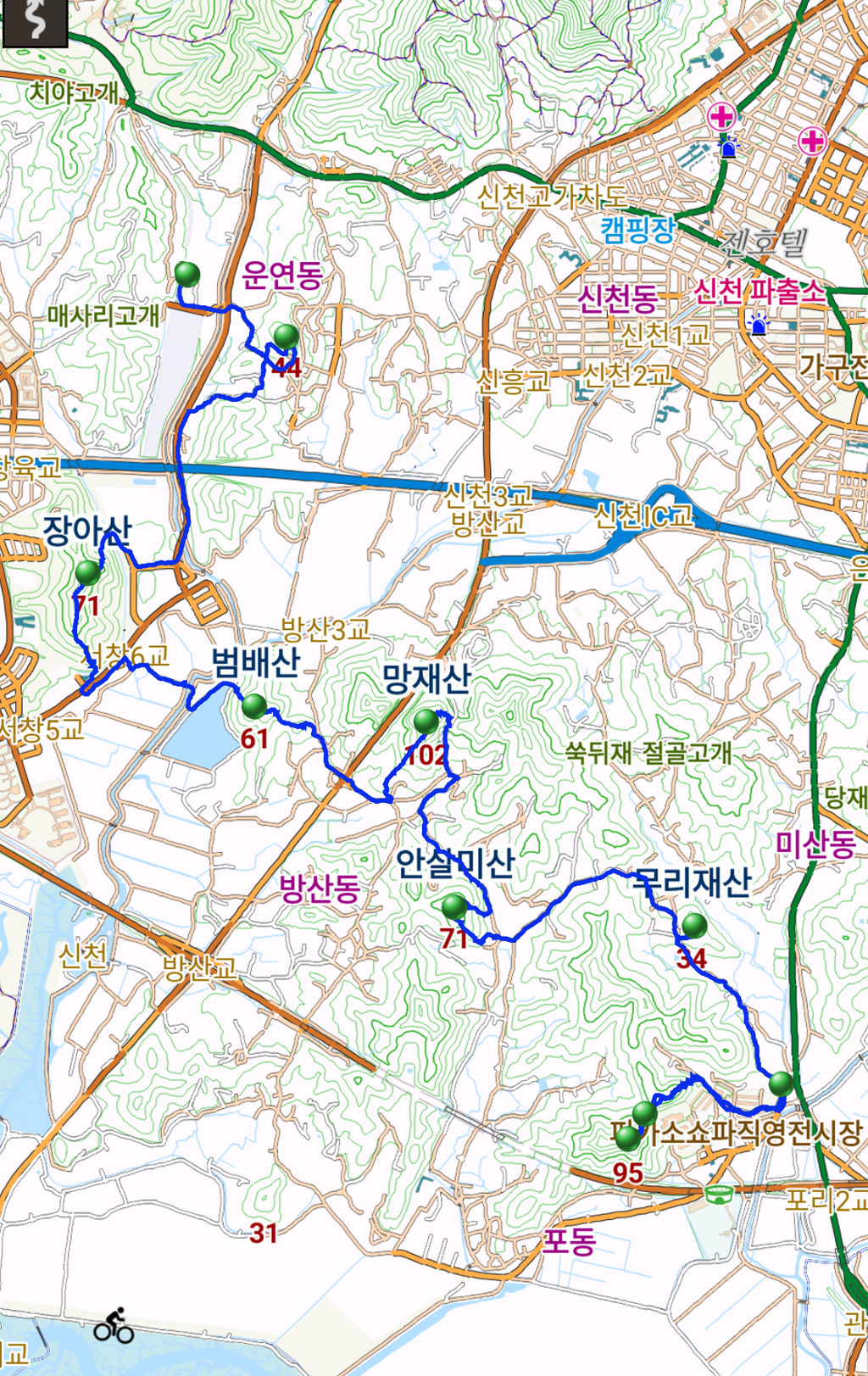 - 산행코스 : 신현역(2번 출구) – 학미산 – 무리재산 – 안살미산 – 망재산 – 범배산 – 장아산 – 뒷동산 – 운연역(1번 출구) (나 홀로 산행)