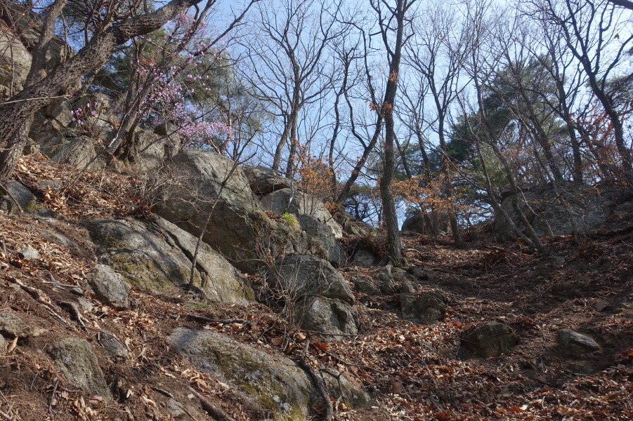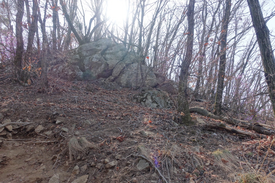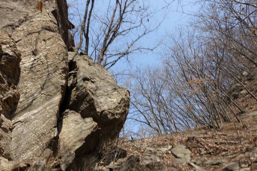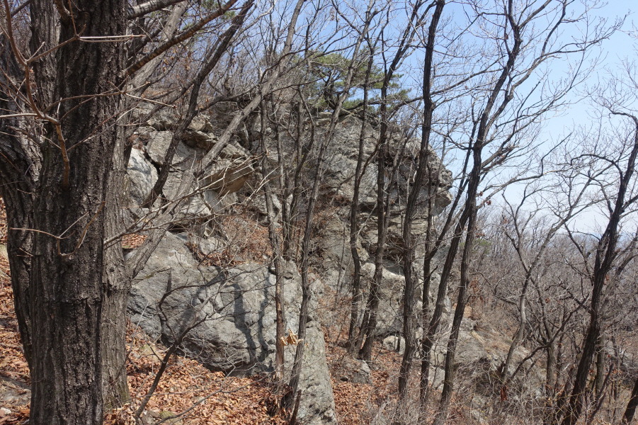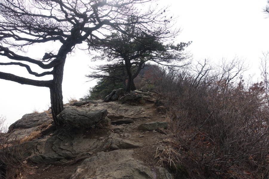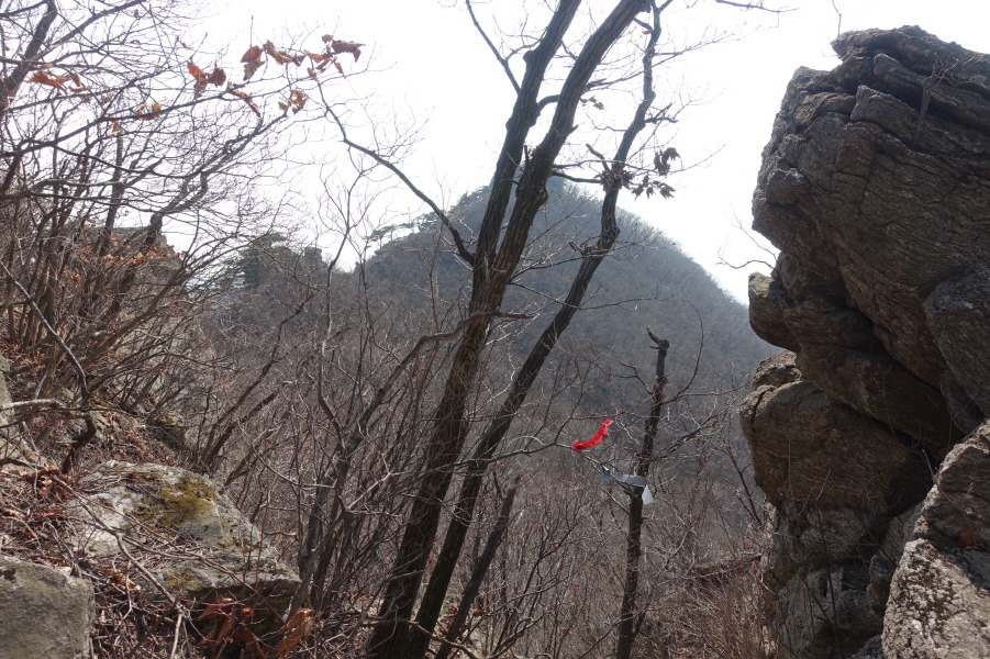천마산 암릉지대다. (15;05) 119표지목(정상0.28km/보광사1.93km)를 지나 (15;11) 바위봉 아래 이정표(천마산260m/철마산6.9km) 서있는 고개 중턱에서 바위봉을 오르지 않고 천마산을 바라보면서 바위홈통을 내려서 바위봉을 좌측에두고 우회하여 능선에 붙는다.