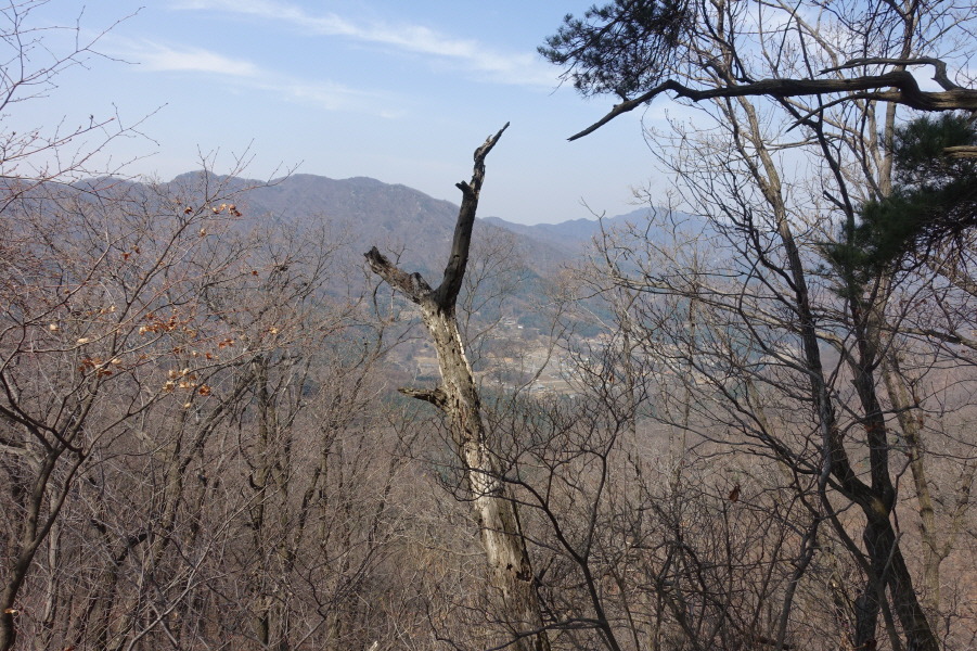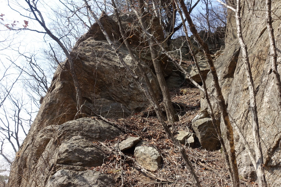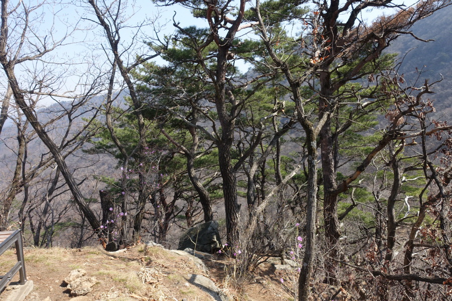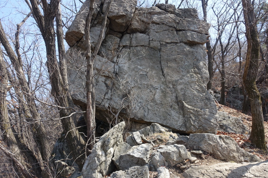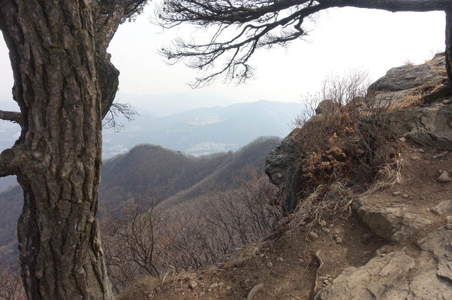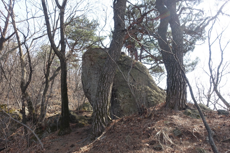천마산 암릉지대다. (15;05) 119표지목(정상0.28km/보광사1.93km)를 지나 (15;11) 바위봉 아래 이정표(천마산260m/철마산6.9km) 서있는 고개 중턱에서 바위봉을 오르지 않고 천마산을 바라보면서 바위홈통을 내려서 바위봉을 좌측에두고 우회하여 능선에 붙는다.