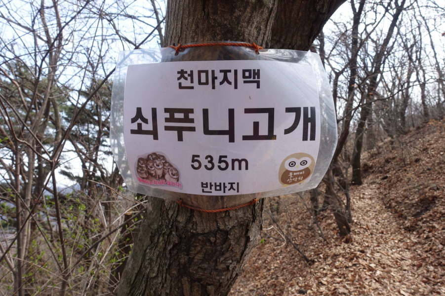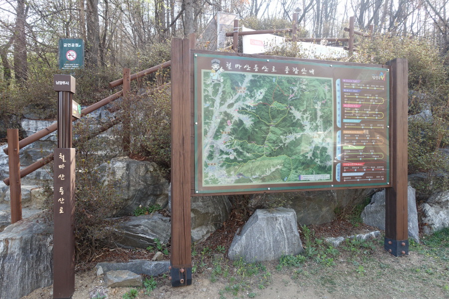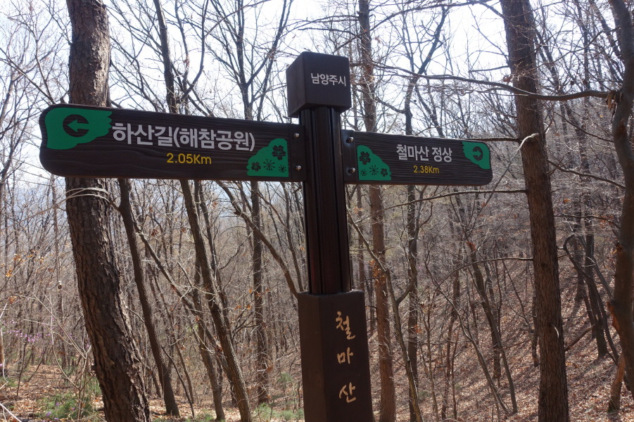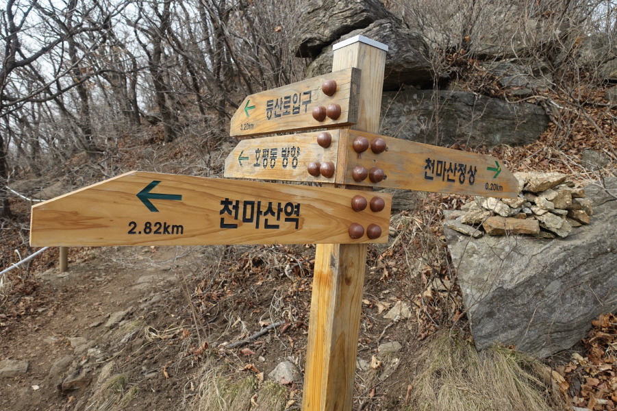 (15;34) 이정표(천마산역2.82km/호평동방향/등산로입구3.10km/천마산0.20kmm).(15;35)이정표(천마산역2.80km/관리사무소2.68km/등산로입구마치고개.백봉3.10km/천마산210m)를 지나 내림길 내려선다.