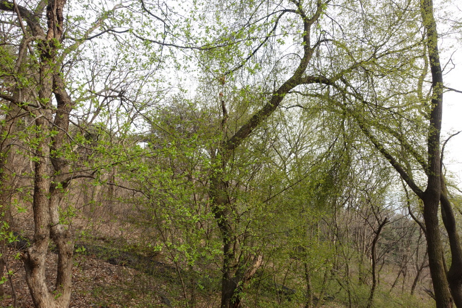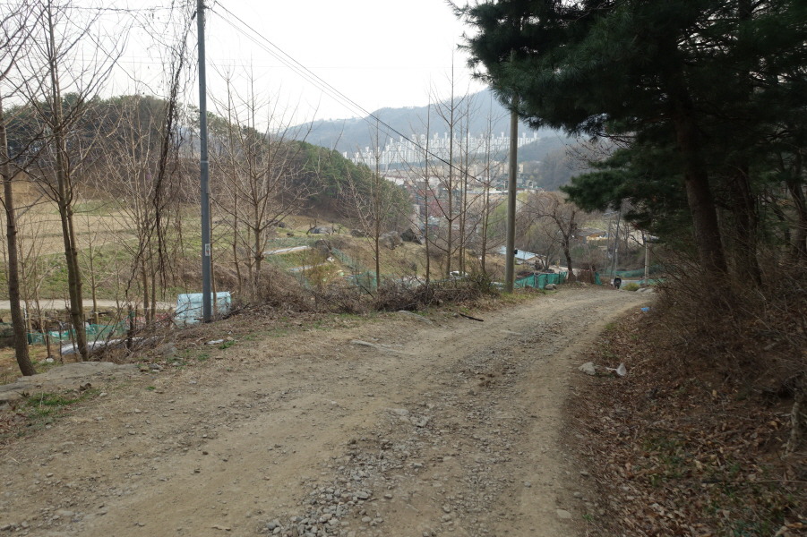 편안한 능선 안부3거리에서 직진이 천마산 방향인데 우측길이 좋아보여 내려서니 (16;15) 임도에 새싹 돋은 나무가 정겹고 (16;24) 비닐하우스 농가와 민가들이 나온다.