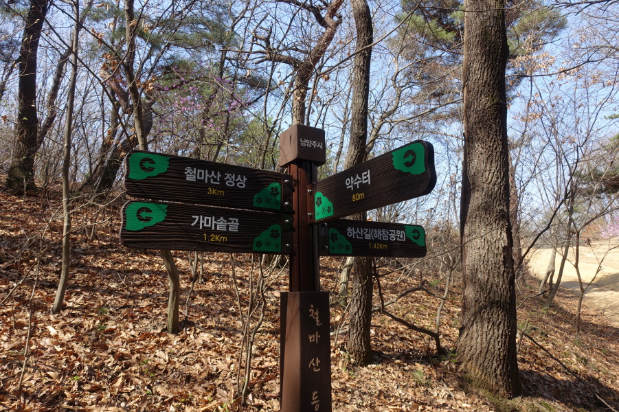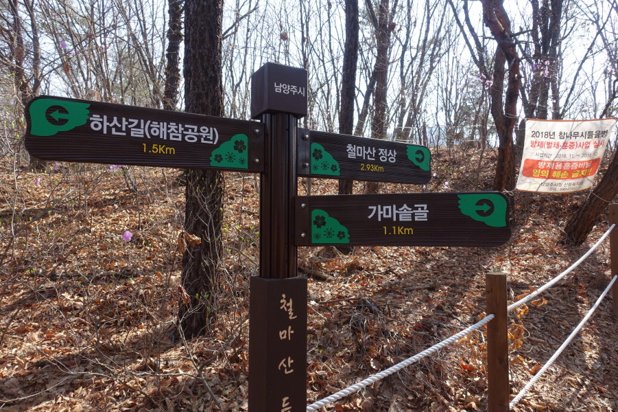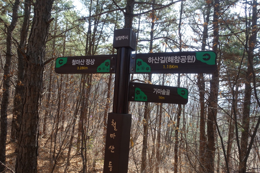 (10;05) 공장이 보이는 이정표(철마산정상3.84km/하산길 해참공원590m). (10;08)이정표(철마산정상3.71km/하산길 해참공원720m/하산길 해참공원730m)을 지나 묘지위에서 조망이 터지고 (10;15)가마솥골 갈림이정표(철마산정상3.28km/가마솥골1km/하산길 해참공원90m) (10;19) 약수터 갈림이정표(철마산정상3.0km/약수터80m/가마솥골1.2km/하산길 해참공원1.43km) (10;20) 가마솥골 갈림이정표(철마산정상2.93km/가마솥골1.1km/하산길 해참공원1.5km)를 지난다.