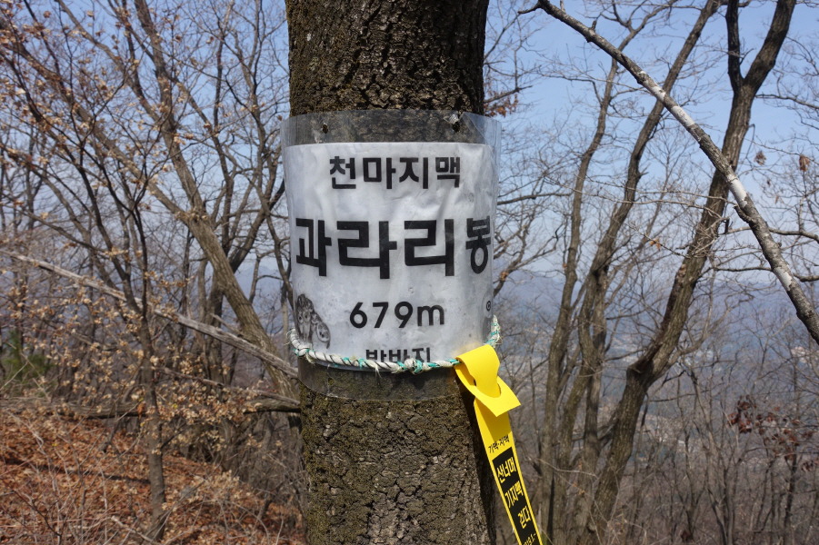 가곡리 갈림이정표( 천마산2.4km/가곡리4.8km/철마산4.6km)표지목에 매직으로 쓴 과라리봉이 표기되어있고 비닐코팅 과라리봉 표지판이 나무에 매여있다.