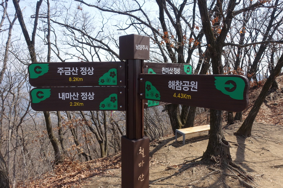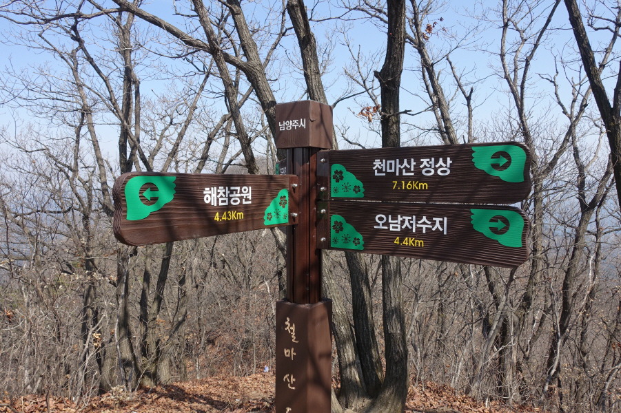 이정표(천마산정상7.16km/오남저수지4.4km/내마산정상2.2km/주금산정상8.2km/하산길해참공원4.4km) 입니다.