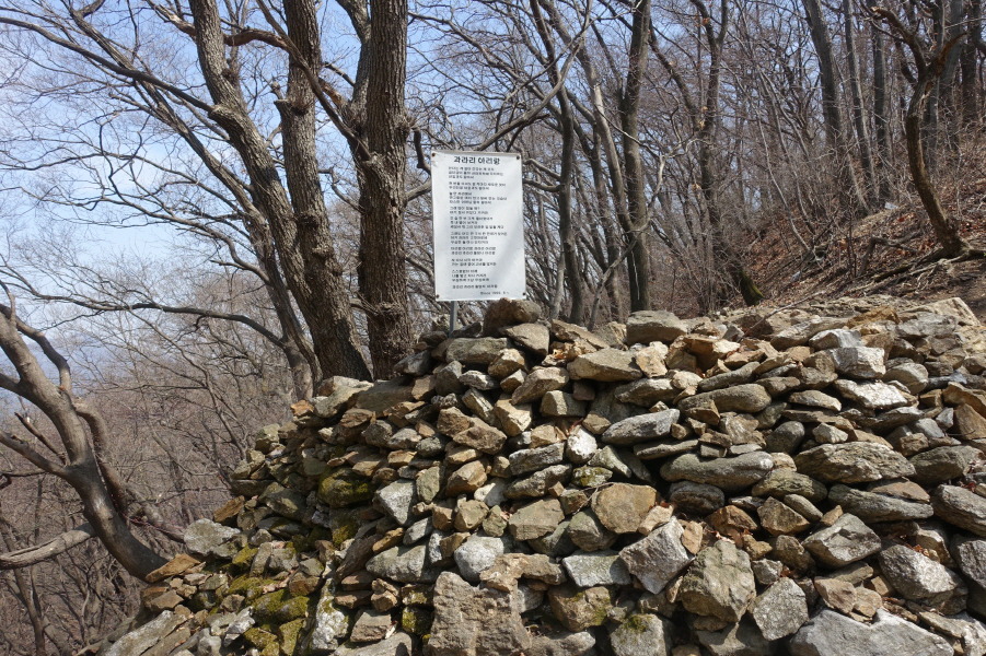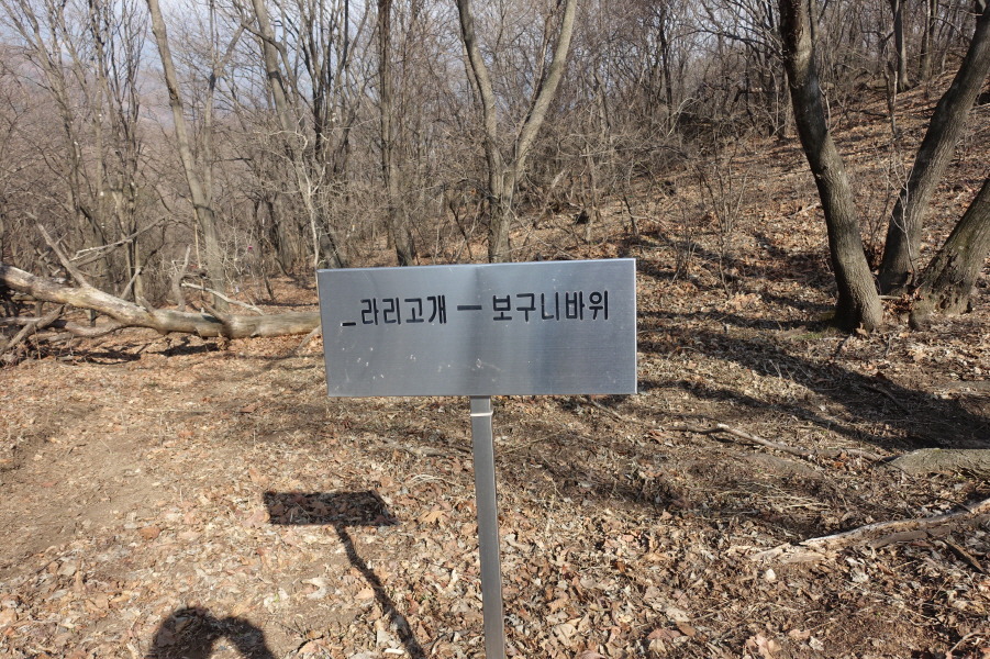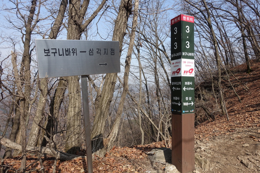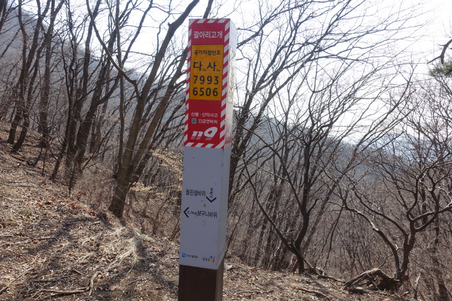 (14;58)안내판(보구니바위-삼각지점)과 119표지목(정상0.96/보광사0.67km/과라리고개0.5km)이 서있는 고개 마루다.
