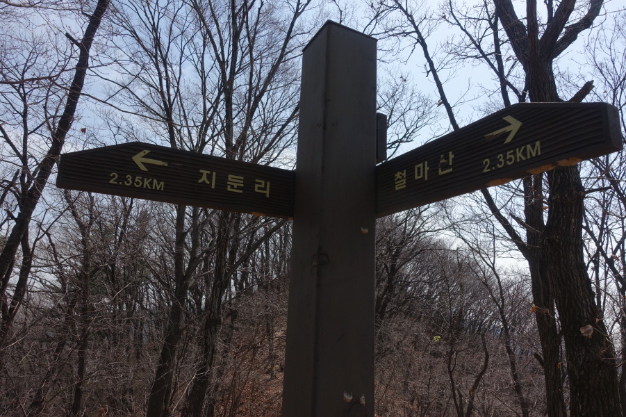 (13;29) 지둔리 갈림 新이정표(천마산3.54km/지둔리2.35km/철마산2.35km)입니다. km 거리가 ~~