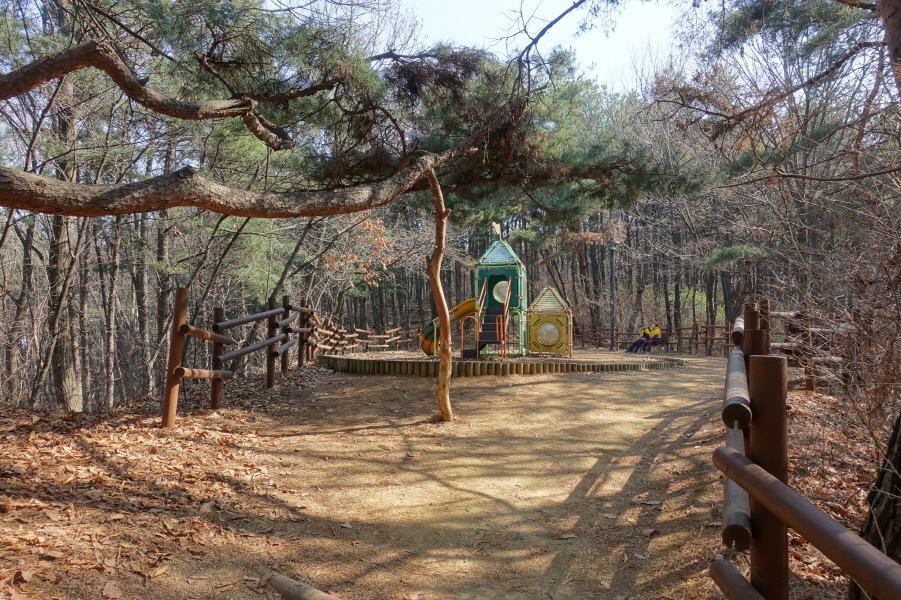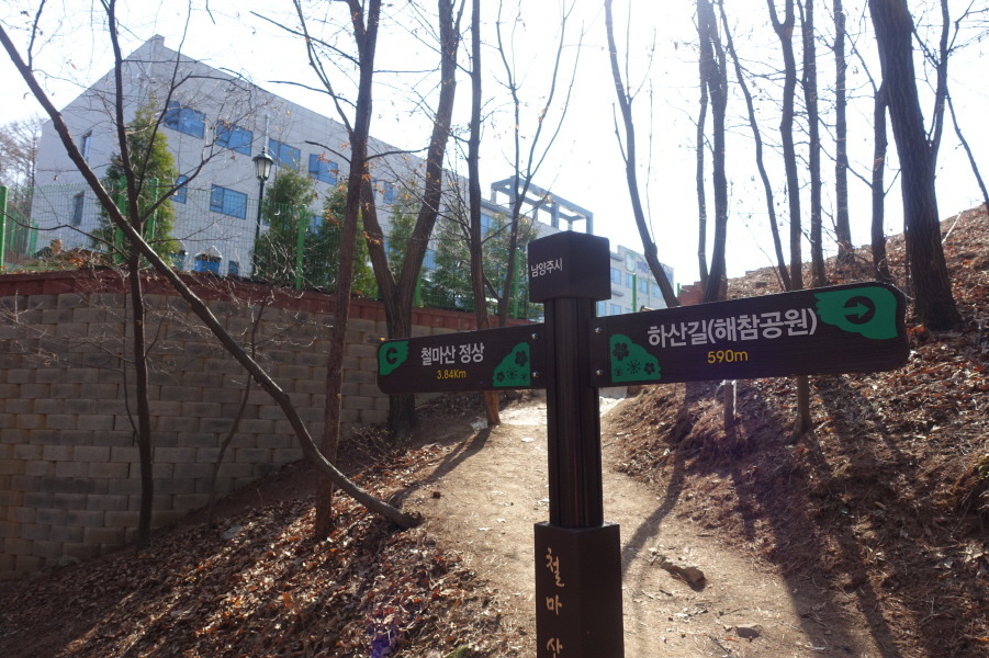 (09;51)이정표(철마산정상4.34km/하산길 해참공원90m).(09;57)이정표(철마산정상4.26km/하산길 해참공원150m)를지나 (09;59) 어린이 놀이터를 통과한다. (10;01)이정표(철마산정상4.06km/하산길 해참공원370m).(10;03)해당마을 갈림이정표(철마산정상3.96km/해당마을/하산길 해참공원470m).