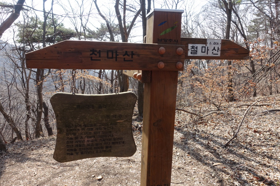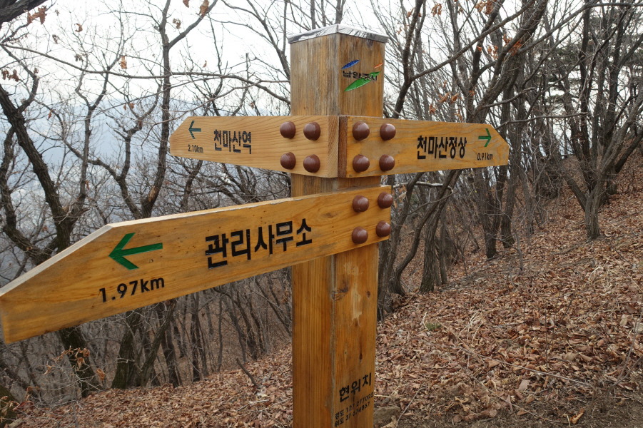 (15;51)이정표(천마산역2.10km/관리사무소1.97km/천마산정상0.91km)에서 관리사무소 방향을 버리고 우측 천마산(2.10km)방향 내려섭니다.