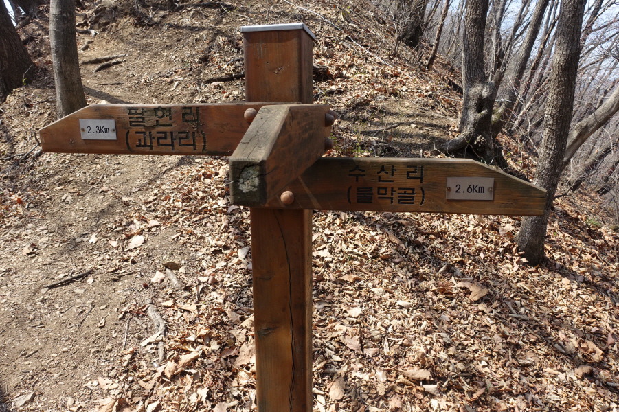 (13;10)4거리 팔현리=과라리/수산리=불막골 갈림 이정표(천마산3.9km/팔현리=과라리2.3km/수산리=불막골2.6km/철마산3.1km)입니다.