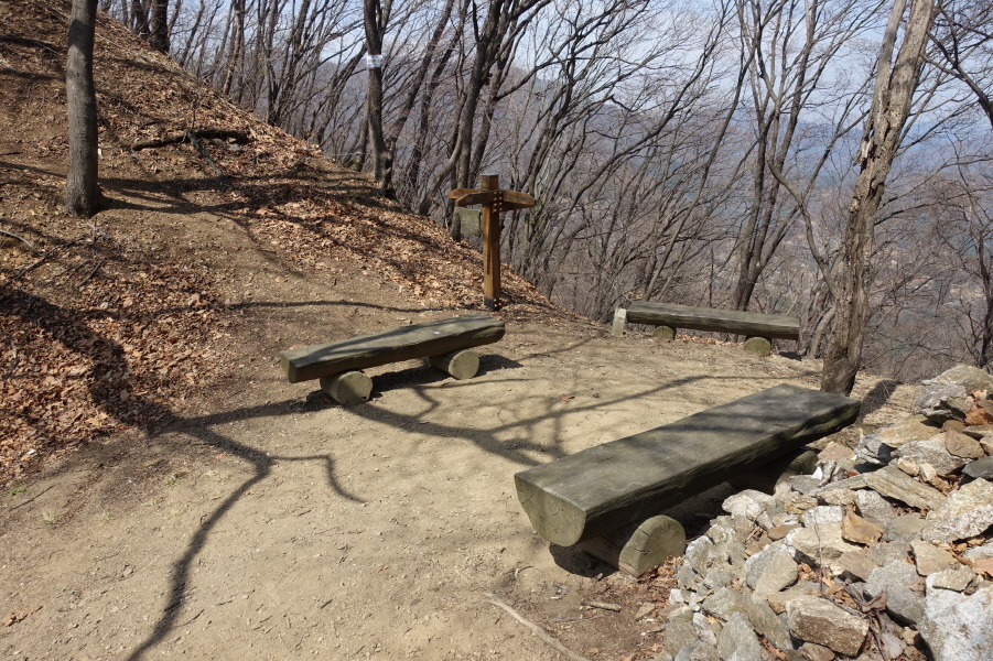 팔현리=고라리/수산리=불막골 갈림 이정표(천마산3.9km/팔현리=과라리2.3km/수산리=불막골2.6km/철마산3.1km) 서있고 돌탑에 과라리 아리랑 가사가 놓여 있다. 자연 원목 장의자 4개가 놓여 있는 휴게터 안부다.