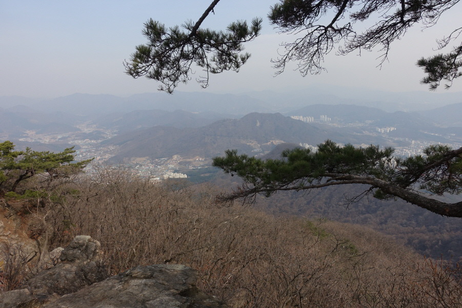 (14;22)능선길 조망터에서 조망즐기고 (14;37) 배랭이고개 안부를 지나 오름길 오른다.(14;47)팔현리 갈림이정표(천마산0.7km/팔현리4.6km/철마산6.4km)와 119표지목(돌핀샘바위3.0km/보구니바위2.7km)을 만난다. (14;45) 바위와 소나무가 기형으로 어우린 봉에서 능선길 이어가 바위봉을 우측으로 우회하여 오른다.