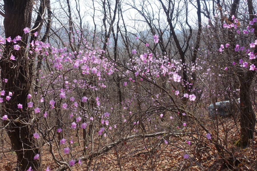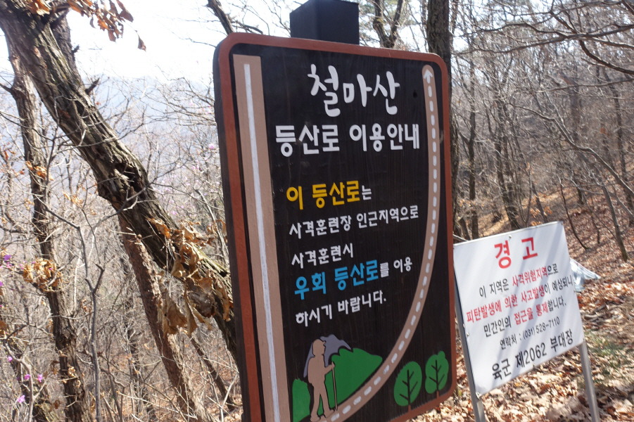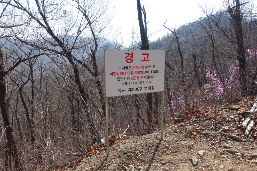 (10;32) 이정표(철마산정상2.38km/하산길 해참공원2.05km)를 지나 진달래가 고운 능선길을 오른다. (10;39) 피탄발생 안내 경고판을지나 (10;44)전면에 바위봉이 조망된다. (10;47)바위를 담아보고 (10;48) 철마산등산로 이용안내판 우회등산로를 지나 오르니 목표봉이다.[2.73km][60분]