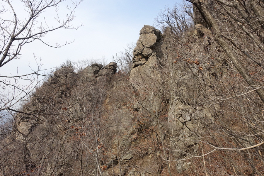 11;03 우회길에서 바위봉 능선을 올려다봅니다.
