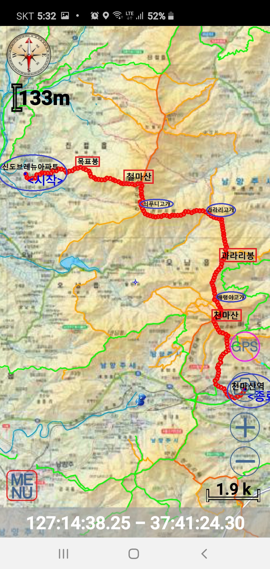 산행코스;신도브레뉴아파트-진접의해참공원-목표봉-철마산(711)-과라리봉-천마산(820)-뾰족봉-천마산역