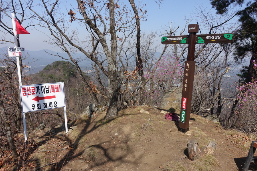(11;10) 소나무 2그루 아래 널다란 4각평상과 이정표(철마산정상750km/하산길 해참공원3.4km)서있는 봉이다. (11;19)등산로아님 이정표(철마산정상750m/하산길 해참공원3.68km)에서 가야할 철마산이 험하게 조망된다. (11;22)암릉 등로를 내려서고 (11;31) 이정표(철마산정상310m/하산길 해참공원4.12km)에서 본격적인 철마산 오름길이다.