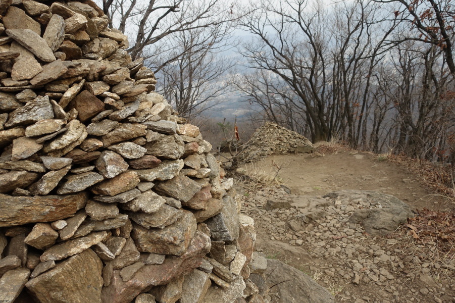 (15;44)이정표(천마산역2.42km/관리사무소2.33km/천마산정상0.56km)를 지나 (15;48)돌탑2기가 서있는 곳에서 급경사 내림길 내려선다. (15;51)이정표(천마산역2.10km/관리사무소1.97km/천마산정상0.91km)에서 관리사무소 방향을 버리고 우측 천마산(2.10km)방향 급경사 내림길 내려선다.