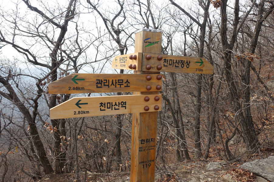 (15;35)이정표(천마산역2.80km/관리사무소2.68km/등산로입구마치고개.백봉3.10km/천마산210m)입니다.