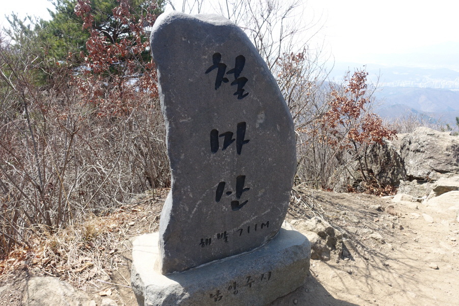 철마산 정상석과 국기봉 기념식수 2그루. 장의자 3개가 놓인 넓은 공터다. 이정표(천마산정상7.16km/오남저수지4.4km/내마산정상2.2km/주금산정상8.2km/하산길해참공원4.4km) 서있다.