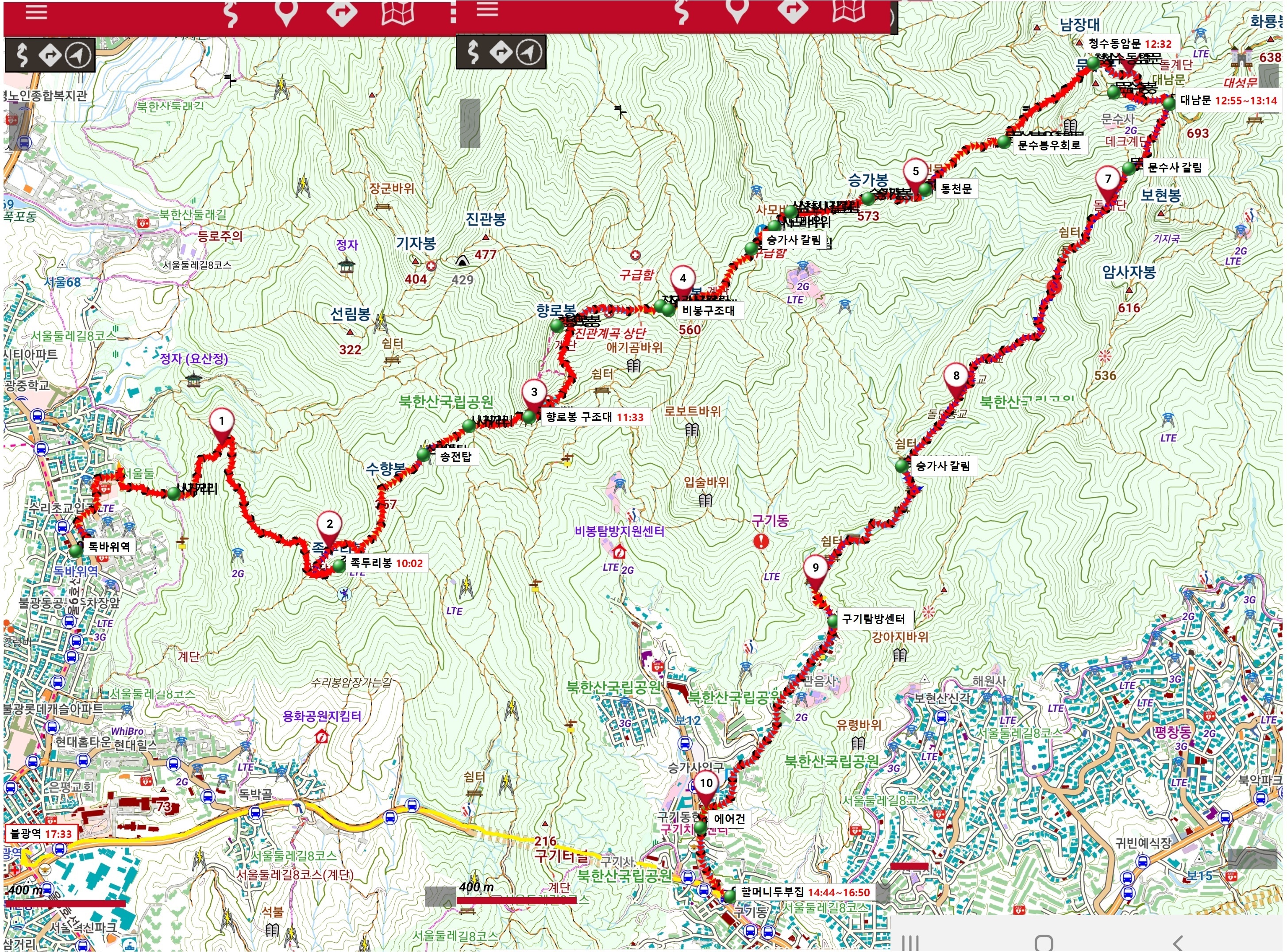 ※ 산행 팁: ① 청수동암문에서 문수봉으로 가는 진입로가 없어져서 길따라 가면 대남문에서 다시