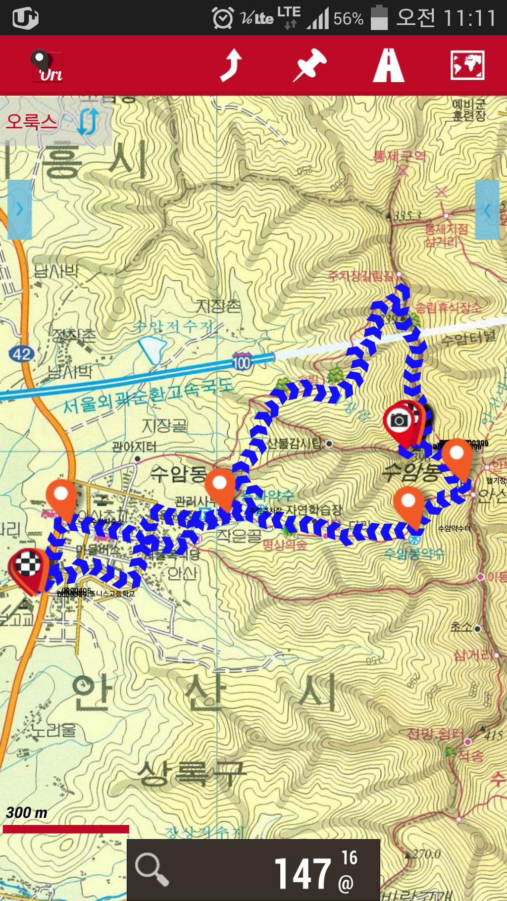 안산국제비즈니스고등학교(58m) → 수암등산로입구(관리사무소/69m) → 수암봉(秀岩峰/398m) → 헬기장(312m) → 수암약수터(194m) → 수암등산로입구(관리사무소/69m) → 수암파출소(39m) → 안산국제비즈니스고등학교(58m)